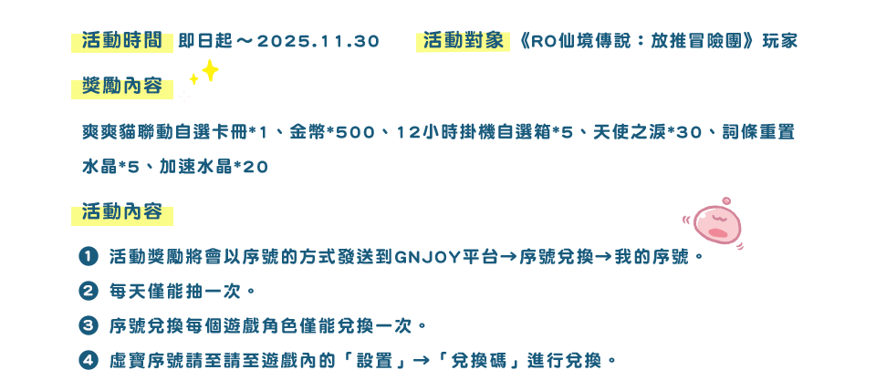 ☆ 本活動獲得之獎勵序號將於2025/11/30 23:59兌換截止。